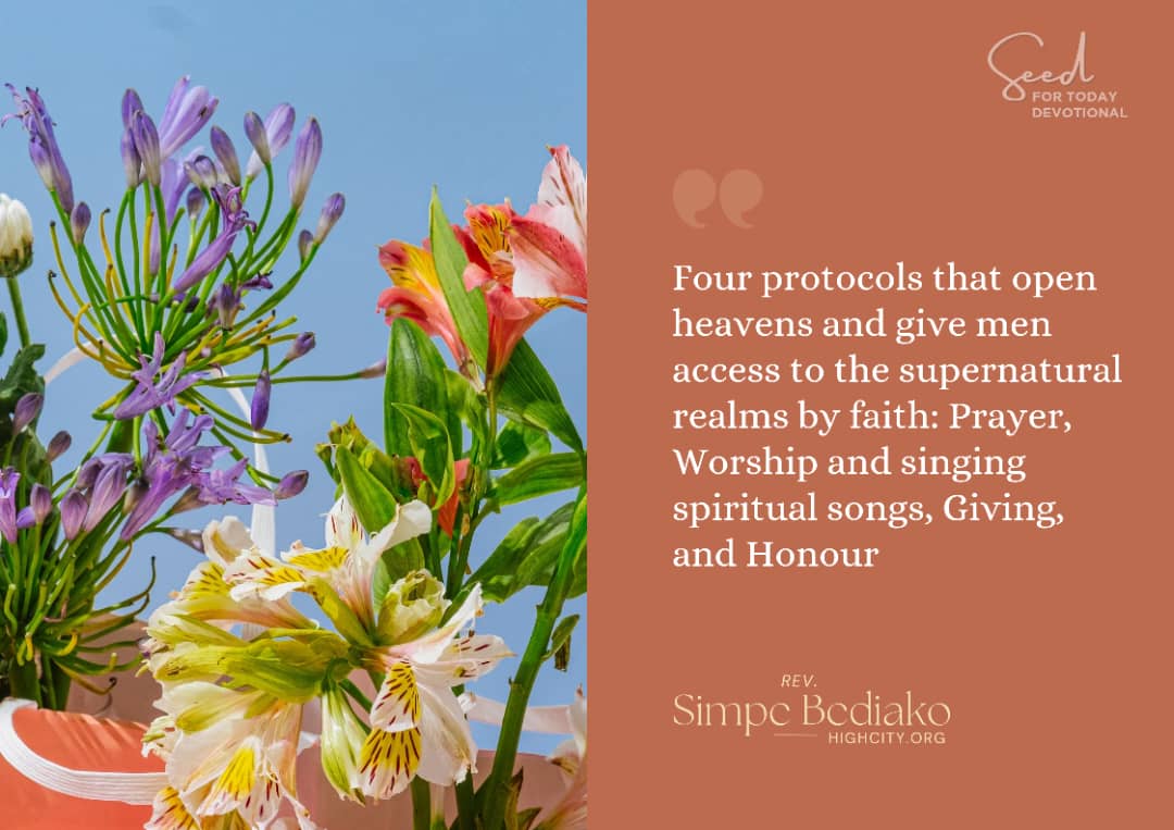 Now! Always remember that there are four protocols that open heavens and give men access to the supernatural realms by faith: Prayer, Worship and singing spiritual songs, Giving, and Honour. I am exhorting you to take every opportunity to pray, worship, give, and honour God, seriously! There isn’t any natural door that opens to heaven, the access to heaven is by faith and this faith is expressed through prayer, worship, giving and honoring God! May you gain access to the supernatural realms!