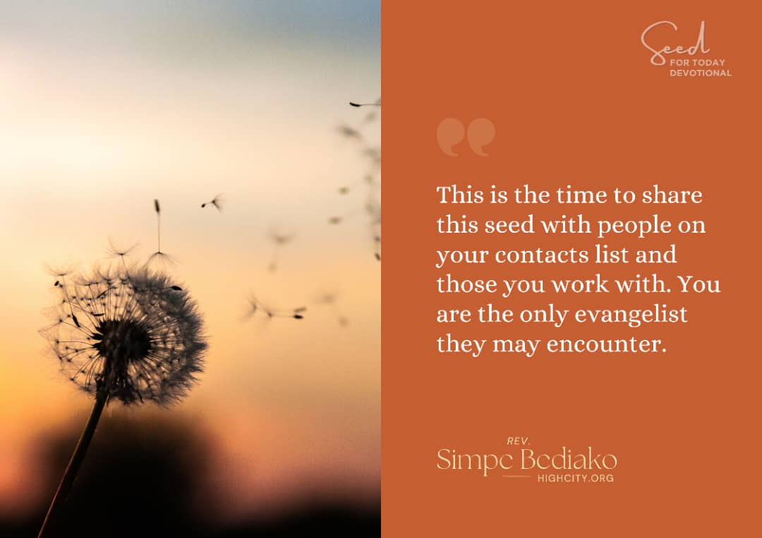 The church was called to go out and preach the gospel. We were called to go into the world. God did not call us to stay in the chapel and wait for the world to come. The seed for today is to share this seed with someone. Share the seed with people in the place you live, work, shop, and play. This is the time to share the link with someone to share with another. This is the time to share the seed. The seed will work and take over the world when we share it with others.